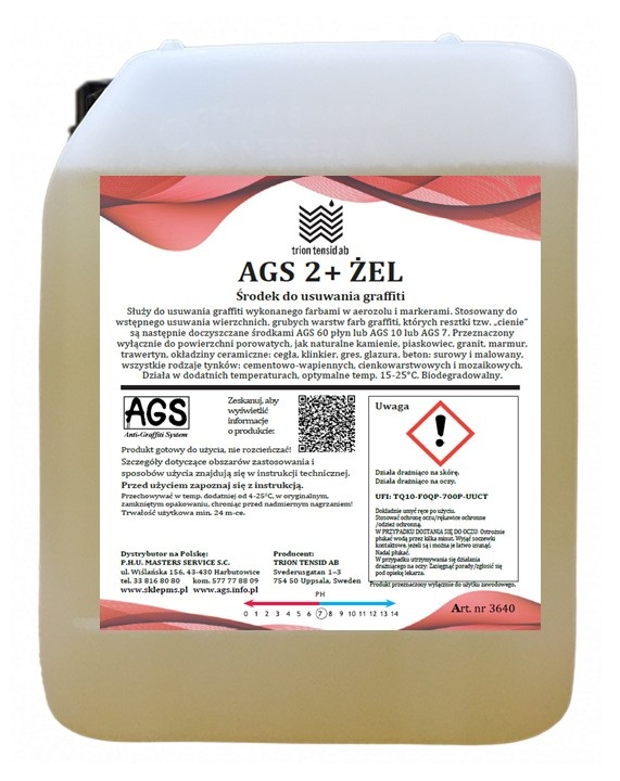 Stosowany do wstępnego usuwania wierzchnich - grubych warstw farb graffiti, których resztki tzw. „cienie” są następnie doczyszczane środkami AGS 60 płyn lub AGS 10 lub AGS 7 które są elementem typowego procesu usuwania graffiti z powierzchni porowatych.