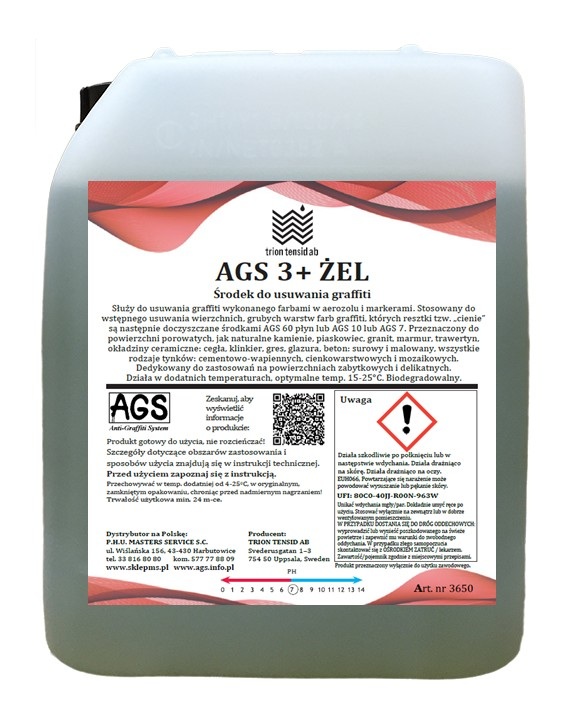 Stosowany do wstępnego usuwania wierzchnich - grubych warstw farb graffiti, których resztki tzw. „cienie” są następnie doczyszczane środkami AGS 60 płyn lub AGS 10 lub AGS 7 które są elementem typowego procesu usuwania graffiti z powierzchni porowatych.
